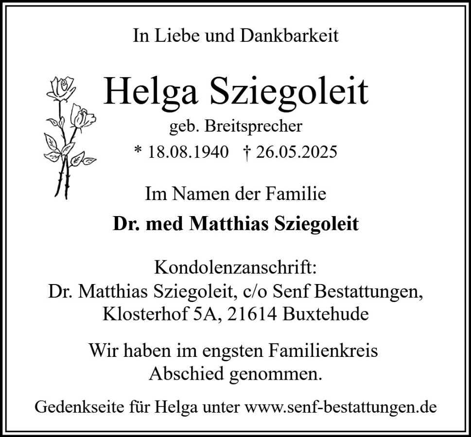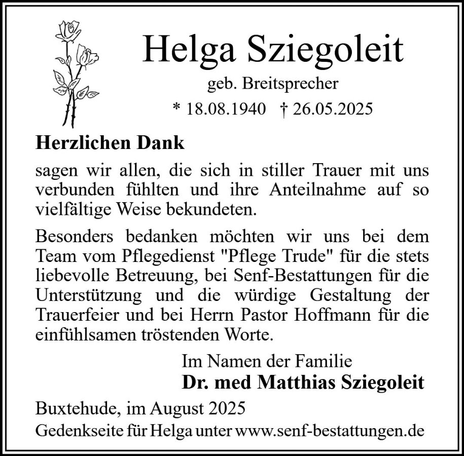 Hallo Herr Dr Sziegoleit. Ich sende Ihnen mein aufrichtiges Beileid. Ich durfte für Sie beide in Ihrer Praxis mein Schulpratikum verbringen. Sie beide haben mir viel medizinisches Wissen beigebracht. Ihre Frau war für mich ein besonderer Mensch und der Anfang in das Arbeitsleben.